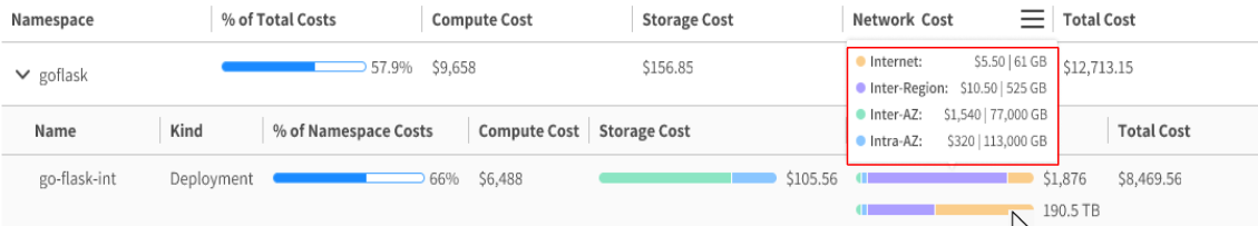 Instead of seeing the cost of an entire cluster, you can see costs broken down into namespaces and individual workloads within each namespace, and you can filter according to your container labels and annotations. This information is further broken down into compute and storage costs for each workload. This enables you to understand the costs of your cloud infrastructure and provides an essential tool for managing your cloud expenses.